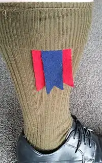 • Garter Tabs – Also known as "woodchucks" Garter Tabs were worn with uniform shorts with the practical use of holding up knee high socks. Garter tabs also served the additional use of identifying the unit that the wearer belonged to. RNZAOC Garter Tabs were blue and Red.