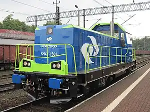 Newag 6Dg is a diesel powered shunter locomotive, modernised by Newag from the locomotive SM42 series by Fablok. The locomotive has a Caterpillar C27 diesel engine, which reduces emissions in accordance with the standards required since 2009. It is equipped with a microprocessor control system and remote control. Compared to the SM42 series, the locomotive appears completely different.[3][4]