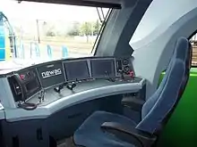 The driver's cab can accommodate two drivers. Each cab is equipped with two independent panels that display the drive parameters, a diagnostics module and event recorder with a speedometer function, a two-module climate control system and rear-view mirrors with a monitor for four cameras. The cabin is in accordance with the EN 1527 standard.[9]