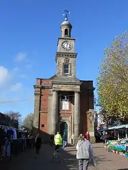 The building was commissioned to replace an earlier guildhall located just to the north of the current building.[2] The new guildhall was completed in November 1713.[1] It was a two-storey rectangular red brick building which was initially open at ground level, with rounded arches on all four sides and three pillars within to support the floor above; this enabled the lower level to be used for a market. The brickwork was ornamented with stone pilasters and topped with a balustraded parapet; the hipped roof was topped by a weatherboarded turret with a gilded weathervane. The upper room was used for meetings of the borough council, for the Quarter Sessions court and for public gatherings. A clock and cupola replaced the turret in the middle of the roof in 1830.[2]