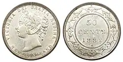 The Newfoundland fifty cent piece was the last denomination to be added to the Victorian coinage. Its first year of issue was 1870. The laureate portrait is stylistically unlike anything used for the rest of British North America. The denomination became very popular and assumed importance after the failure of the Commercial and Union Banks of Newfoundland during the financial crisis of 1894.[1]