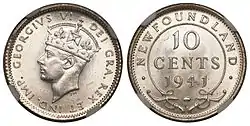 The obverse for this denomination used Percy Metcalfe’s standard portrait of George VI for British colonial coinages and the existing Edward VII/George V reverse. The mintage figures for 1946 and 1947 are considered unofficial. The same issue occurred with the Newfoundland five cents coins of the era. Published official mint reports do not indicate any mintage of the denomination during 1946, although there appears to be 1946 coins created in 1947.[4] Therefore, mintage figures for 1946 and 1947 are unofficial.