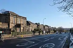The rigorous imposition of Georgian and Victorian feuing plans means that, south of Salisbury Place/Salisbury Road, the density of buildings has remained low.[104] In this southern part of Newington, the area between the major north–south thoroughfares of Dalkeith Road and Minto Street is crossed by quieter residential streets.[94] In the area between Salisbury Road, Minto Street, Dalkeith Road and West Mayfield, James Gillespie Graham's feu scheme of 1825 has created regular plots for a mix of detached villas and larger terraces, which rise to one or two storeys. Many of the front and back gardens in this area display mature tree growth.[105] Interruptions to this pattern include the 1930s additions of the synagogue and the five-storey nurses' housing block on Salisbury Road.[106]