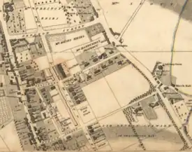 The modern bounds of Newington contained some smaller development prior to the end of the 18th century. The farmlands of Mayfield, earlier known as Newlands, centred on Mayfield House on Mayfield Loan.[15] This land had first been feued out of the Burgh Muir in 1530.[16] Prior to 1800, there were also cottages at Echo Bank on Dalkeith Road and at the Powburn near Mayfield Road.[17] There was also development along Causewayside, including a house whose two sections were known as Broadstairs House and Wormwoodhall. This stood on a site between Salisbury Place and Duncan Street until its demolition in 1880. James Grant attributes the house to a doctor of James IV or V, in whose family, Grant claims, the house remained until the end of the 18th century, after which it became slums.[18][19] Summerhall was feued in 1705 and a brewery is recorded there as early as 1739.[18][20]