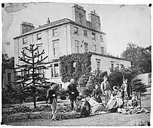 After Sir George Stewart's death in 1822, Newington House had passed through a number of owners until its occupation in 1852 by Liberal politician, Duncan McLaren. At the western edge of Newington, McLaren acquired the lands of Mayfield and Rosebank along with the village of Powburn.[46] From 1862, the area around Waverley Park was feued to a plan by David Cousin.[47] In 1864, Cousin radically revised this scheme to create a plan of curving streets centring on a communally-owned green space at Waverley Park. This may have been inspired by a similar scheme at London's Ladbroke Grove. Cousin also proposed that, like the Blacket development to its north, entry to this scheme would be guarded by gates and lodges.[48] Lodges remain at the Dalkeith Road entrance to Queen's Crescent and on Peel Terrace.[49]