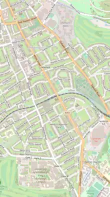 The A701 and Dalkeith Roads represent major routes into Edinburgh city centre, which is between 1 (1.5km) and 2.5 miles (4km) north of Newington.[89][90][91] The Southside borders Newington north of Hope Park Terrace/Bernard Terrace.[92] Cameron Toll and Nether Liberton border Newington south and west of the busy thoroughfares of Lady Road and Liberton Road.[91] The former Edinburgh Suburban and Southside Junction Railway runs east to west through the southern part of Newington. Though closed to passengers in 1962, it remains in use for freight.[93]
