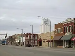 In 1901, Newkirk suffered a major reversal when nearly a whole block of its thriving downtown burned. The wooden buildings that burned were mostly replaced with stone buildings from the distinctive yellow limestone quarried four miles east of Newkirk. "Imposing stone buildings began to give dignity and permanence to the dusty streets, while wood-frame homes gradually replaced the 'proving-up' homes of the Run. Young Elms, Cottonwoods, shrubs, and flowers began to change the once treeless prairies into shaded garden spots."[11] Newkirk's business district was placed on the National Register as a historic district in 1984.[12]