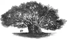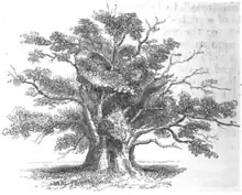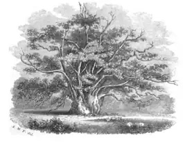 As one of the largest oaks in the country the tree was the subject of some fame. The antiquary John Timbs described it as "one of the most remarkable trees in the country" in 1839 and an engraving of the tree was included in P. J. Ducarel's De Wyrhale book of poetry in 1836.[6] By 1874 the tree was said to be "battered and decaying", though naturalist Edwin Lees thought it might live another 500 years.[7]