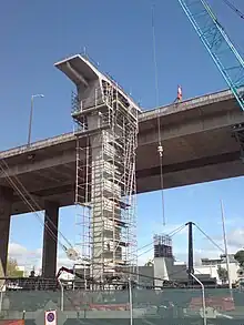 Construction began in earnest in April 2007, with the first foundations for the up to 18m high piers of the southbound part of the new viaduct. A bracing structure under the section carrying over the railway line was established over Easter 2009, and a 140m long, 800 ton heavy[15] launching gantry was erected above the Newmarket skyline, which moved into place new sections and stabilised parts to be demolished (with the demolition considered the most difficult part of the project). The southbound addition was to be finished by the end of 2010, while the northbound section was expected to take at least until March 2012.[16] During construction, sight screens reduced visual distractions of passing drivers, though the construction still required narrowing of the traffic lanes and reduction of the maximum speed on the viaduct to 70 km/h. A number of temporary support girders around the structure were also required to safely cater for the stresses put on the structure while parts of it were demolished and rebuilt.[9]