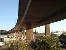 While considered a successful design, it was built to far lower earthquake standards than those which other New Zealand structures now fulfill, being built to survive only a 1 in 500-year return period earthquake. It could have received significant damage in an earthquake as common as once in 200 years.[4] This made the structure the weakest strategic transport infrastructure link in the Auckland area, with a potential collapse cutting off all motorway transport to the south.[5] Also, during design, temperature stresses were not yet understood to a sufficient degree, leading to cracking between the black bitumen coat and the light-coloured concrete beams below.[1][3] This issue was rectified by the additional of additional pre-stressed cables and an additional light-coloured stone chip placed on top of the bitumen.[3]