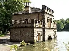 Chevet Hall was a mansion that stood on the site of an older hall to the east of Newmillerdam and was built in 1529 by the Neviles. The hall was demolished as a result of mining subsidence in the 1960s, despite a massive outcry from locals.[5] In 1765, the hall and estate was acquired by the Pilkingtons; in 1820, they built the boathouse on the lake on their private grounds. The Pilkingtons built lodges around their 2,340 acres (9.5 km2) private estate to deter poachers; some of them survived. It was opened to the public after Wakefield Council bought the estate in 1954. The boathouse is a Grade II listed building.[6]
