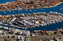 The north end of the Newport Harbor channels surrounding Lido Isle has several small business centers and was at one time used as a home by the fishing fleets. On the North East side of the channel, the Lido Marina Village now acts as the local port to many "Newport Party Boats" that can be rented for events, as well as small merchants and local restaurants. It also hosts the area boat show each year, and an organic "Farmers Market"[18] on Sundays, in addition to being the port for the local Gondola Company.[19] In 2014, the center was closed for a renovation.[20] The Lido Village was reopened in 2017 after a complete renovation.[21]