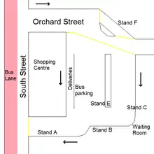 There is a network of bus lanes through Newport town centre which lead to the bus station, with the aim of speeding a bus's passage into the bus station. They are located on St James' Street and South Street, and go against the direction of flow of these otherwise one-way streets. For the rebuilding of the bus station a temporary bus lane was placed along Church Litten; this was taken out of use and resurfaced to allow regular traffic to use it once the new bus station opened.[1]