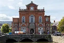 The design required a new three-arched bridge to be constructed to take the weight of the new building.[1] The design of the building involved a symmetrical main frontage with five bays facing onto Bank Parade; the central section of three bays, which slightly projected forward, featured an arched doorway flanked by Doric order columns supporting an entablature inscribed with the words "Town Hall", above which there was an open pediment containing a large cartouche with the town's coat of arms.[1] On the first floor, there was a Venetian window flanked by pilasters and, at roof level, there was a central gable containing a clock topped with a pediment which contained a terracotta panel inscribed with the year "1893" in the tympanum.[1] The outer bays of the central section featured round headed windows flanked by pilasters on the first floor and there was a balustrade with corner urns at roof level.[1] Internally, the principal room was the council chamber.[3]