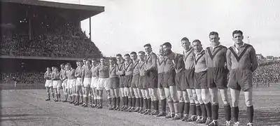 Newtown (left captained by Frank Farrell) lines up with Norths before the 1943 Grand final.