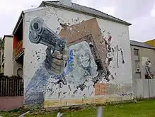 Since the 1980s, the area surrounding the Sydney inner west suburb of Newtown, Australia, including the suburbs of Newtown, Enmore, Erskineville, Camperdown and St Peters, has been known for its wide range of prominent graffiti and street art on walls. [1] The public visual art in the Newtown area consists of a variety of styles and methods of execution, including large-scale painted murals, hand-painted (or sprayed) political slogans, hand-painted figurative designs, spray painted semi-abstract designs (including large-scale and elaborate semi-pictorial) "tags"), and other stylistic developments such as stencil art and street poster art (also known as "wheatpasting"), "Yarn bombing", and sculptural items cast from plaster and other materials.[2]