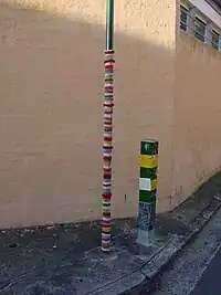 - Yarn bombing involves the creation of pieces of multi-coloured knitted fabrics, which are wrapped around objects such as trees and poles and stitched into place to create a colourful "sleeve". Around Newtown, this medium has typically taken the form of multi-coloured knitted piece which are stitched around the steel support poles of local road signs.