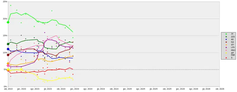 | SKDS/LTV[1] | November 2023 | [lower-alpha 1] | 18 | 13.2 | 7.6 | 10.1 | 9.6 | 11.5 | 11.2 | 2.8 | 2 | 7.2 | 0.3 | 1.5 | 2.3 | 2.8 | 0.4 | 3.6 |