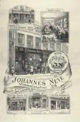 The company was founded when Johannes Neye opened a "galantry shop" at Vimmelskaftet 28 in 1881.[1][2] He opened his second shop at Nygade 3 just half a year later. The company started its own production of leather products in 1891. Over the years, it acquired the entire building at No. 27, the adjacent corner building (No. 30) and two more buildings in Klosterstræde. All four buildings were replaced by a new building designed by Philip Smidth in 1915.[3]