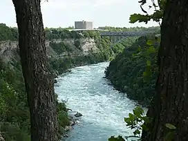 ![]() Niagara River flowing through Niagara Gorge (from eastern brink north of Niagara Whirlpool). The Whirlpool Rapids Bridge is visible in the background. | |