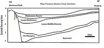 The basement rock of the Nias Basin, at its greatest depth lies at about 4-6 kilometers under the seafloor.[4] This basement rock was determined to be the remains of an older accretionary complex that formed before the Indo-Australian/Sunda collision.[1] The stratigraphic sequence of this basin can be divided into 3 primary sequences.