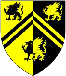 Arms of Eveleigh: Per pale or and sable, two chevronels between three griffins passant counterchanged[1]