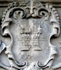 Arms of Sir Nicholas II Hooper (1654-1731): Gyronny of eight or and ermine, over all a castle triple-towered sable.[2] Detail from parapet of The Mercantile Exchange (Queen Anne's Walk) (1713) Barnstaple