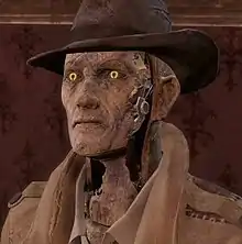 Nick Valentine is a fictional character in the post-apocalyptic themed Fallout media franchise. Valentine is first introduced as a non-player character in the 2015 role-playing video game Fallout 4, where he plays an important role in its main plotline by lending his assistance to the search for the abducted son of the game's player character, the sole survivor of a cryogenics-focused facility designed to withstand nuclear fallout built by a technology company known as Vault-Tec. With cracked synthetic skin torn in spots which expose the metallic structures underneath, Valentine is a type of sophisticated biomechanical android characters in Fallout 4 called "Synths". Possessing the preserved memories of a human police detective of the same name, Valentine is a private investigator whose speech and mannerisms echo the archetypal detective protagonist from hardboiled fiction. Valentine's other appearances include Fallout: Wasteland Warfare, a miniatures wargame which adapts the Fallout universe. Valentine is voiced by American voice actor Stephen Russell.