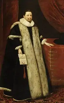 Anne of Denmark, who seemed to be interested in learning the language, enjoyed hearing Molin speaking Italian.[6] King James knighted Molin and in January 1606 allowed him to augment his coat of arms with a "canton".[7] The news letter writer John Pory, after describing the performance of the court masque Hymenaei, mentioned that Molin introduced the new ambassador Zorzi Giustinian; "the old Venetian lieger, Molino, presented to the king and Prince a new lieger, Justiniano. I say 'to the prince' because they delivered a letter from the Signory to him as well as to the King. They came to court in thirteen coaches, they were apparalled in black gowns, lined with the richest fur of all others, black fox".[8] King James gave him a gift of gilt plate, made by his goldsmith John Williams.[9]