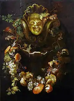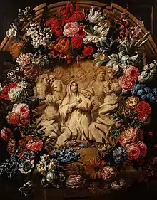 Some of van Houbraken's works fall into the genre of the so-called 'garland paintings'.[9] Garland paintings are a type of still life invented in early 17th century Antwerp by Jan Brueghel the Elder and subsequently practised by leading Flemish still life painters, such as Daniel Seghers. Paintings in this genre initially showed a flower or, less frequently, fruit garland around a devotional image or portrait. In the later development of the genre, the devotional image was replaced by other subjects such as portraits, mythological subjects and allegorical scenes.[13][14] Daniel Seghers developed the illusionistic aspects of the genre by replacing the cartouche portraits with paintings of bas reliefs and sculptures. By using trompe-l'œil effects, Seghers was able to create the illusion of three-dimensionality, for instance by including elements that look as if they protrude outside of the picture frame. The aim was to give the viewer the impression that they were not looking at a painting but at a real garland of flowers around a genuine sculptured cartouche. Abraham Brueghel, the grandson of Jan Brueghel the Elder, introduced the genre into Italy where he worked for 40 years, first in Rome and then in Naples where he died in 1697. The Calabrian Prince Antonio Ruffo was an admirer of Brueghel’s works several of which he collected at his palace near Messina. Van Houbraken may have become familiar with the garland paintings there.[9]