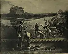 N.I. Kravchenko on the background of the painting "The Taking of Beijing"