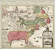 His business flourished, producing town plans, atlases, wall maps, and more than 600 sheet maps.[3] He made maps of places in Europe and North America, including New Spain,[7] places fortified by Vauban,[8] the Low Countries, and the War of the Spanish Succession. In 1698, de Fer published a map of North America, which included a depiction of beavers building dams near Niagara Falls. Seventeen years later, Herman Moll published a map which plagiarized elements of de Fer's work, particularly the beaver scene. It became known as the "Beaver map".[9][10] De Fer became the official geographer for The King of Spain in 1720.[6] Two of his sons-in-law, Guillaume Danet and Jaques-François Bénard, continued the company after de Fer's death on 25 October of that year until around 1760.[1]