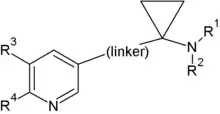 Combination of structural elements of ACh and nicotine as well as reducing the conformational flexibility by using a cyclopropane ring has led to the discovery of potent and selective α4β2 nAChR ligands. The modulation of three structural elements, the linker, substitution on the amino group and the pyridine ring can be used to determine the influence on potency and selectivity of the ligands. Factors that decrease the binding are steric hindrance on the amino group and linkers that are saturated/unsaturated carbon chains. Short-chained ether linkers are preferred. Beneficial effects on the binding is seen with substitution on the pyridine ring both mono- and disubstitution with halogens among other groups. Substitution on the amino group with three different amides increased the binding affinity where methylamide had the highest binding. Lower binding in the other substituted amides was explained by steric hindrance or lack of a methyl group resulting in loss of hydrophobic interaction. Stereochemistry of pyridine nitrogen and/or the pyridine ring and its stereoelectronic effects has a subtle beneficial effect on the binding to the α4β2 nAChR. Thus it was shown that a pyridyl ether ligand with bromo substitution on the pyridine and metylatedamide on the amino group had the highest potency.[24]