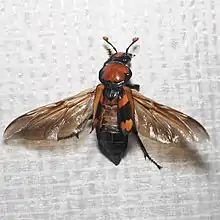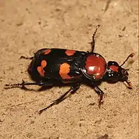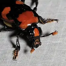 N. americanus adults are between 25 and 45 millimetres (0.98 and 1.77 in) long and can be identified by their striking, distinctive coloring. The body is shiny black, and on each elytron (wing cover) are two scalloped, orange-red markings. Most distinctively, there is an orange-red marking on the pronotum, which distinguishes the species from all other North American Nicrophorus.[4] The front of the head has two orange markings, one on the frons and a smaller one on the clypeus, the sclerite just above the mouthparts. The orange mark on the clypeus is smaller and more triangular in females than in males. The labrum has dense orange setae on the distal edge, and the antennal club is mostly orange. The adult is nocturnal and a strong flier, moving as far as a kilometer in one night.