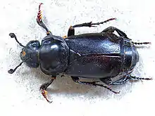 Nicrophorus germanicus is a burying beetle described by Carl Linnaeus in his landmark 1758 10th edition of Systema Naturae. Males are larger than females and can reach a body length of 27 mm.[1]