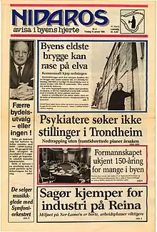 The newspaper was stopped on 17 April 1941 during the occupation of Norway by Nazi Germany. After the war it was published as Trondheims-Pressen from 9 May to 12 May. It started again on 14 May 1945.[1] Nidaros was among the three initiators to establish a working committee for the stopped newspapers (Norwegian: Arbeidsutvalget for de stansede aviser), along with Arbeiderbladet and Dagen. The newspapers, which had all been stopped during the war, had suffered significant losses because of this, and claimed compensation. Around sixty Norwegian newspapers eventually joined this initiative. In Trondheim, the newspaper situation had changed dramatically over the war years. Adresseavisen and Dagsposten had continued their publication during the Nazi regime, while Nidaros and Arbeider-Avisa were stopped.[4] Kåre Fasting was chief editor from 1945 to 1950, and Gunnar Garbo edited Nidaros from 1954 to 1957,[5][6] when Nidaros ceased to appear. Garbo then issued a weekly newspaper Søndagsekspressen, "loosely affiliated" with Nidaros, from February to August 1957. Nidaros started again on 28 February 1959. It changed its name to Trondheimsavisa in February 1989 before ultimately going bankrupt in 1991.[1]
