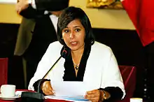In June 2009, she was switched to the Minister of Women and Social Development upon the resignation of Carmen Vildoso. During her tenure, she took initiative in promoting public policies that improved equality of opportunities and family.[5] During her management, the “Gratitude” program was created, aimed at those over 75 years of age, and the free delivery of 5 million identity documents - DNI, to children under 14 years of age in agreement with the National Registry of Identification and Civil Status (RENIEC). She resigned in September 2010 in order to run for congressional reelection at the 2011 general election, although she was not reelected.[6]