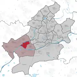 Location of Nied (red) and the Ortsbezirk West (light red) within Frankfurt am Main | |