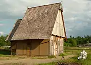 In the Schmeeson Village Project, the remains of what appeared to be a church were excavated in 2005.[12] Initially, Stephan and his team thought they had found a small, squarish building, but in 2004, the site was covered by brush.[13] The local historical society, which supports the project, came out and cleared the site, allowing the researchers to see they had been standing on a mound of stones of various sizes. They also found evidence of plaster and mortar around the entire area.[13] Their excavations in the summer of 2005 uncovered remains of a structure 9 by 16 meters (30 ft × 52 ft), with a considerable number of ceramic and metal finds. The 100 metal finds weighed over 20 kilograms (44 lb).[12] In 2006, Arno Beyer of the University of Kiel took samples of soil from the site for further research.[14] The trenches that were dug for this purpose went to the natural bedrock and revealed numerous postholes, as well as ceramic finds pre-dating the church, providing researchers with evidence of a community.[14]
