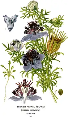 Nigella hispanica, the Spanish fennel flower, is a species of flowering plant in the family Ranunculaceae, native to Portugal, Spain, and France.[1] An annual or biennial reaching 60 cm (2 ft), the Royal Horticultural Society considers it a good plant to attract pollinators.[2]