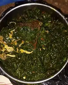 - Efo riro, a stew made from leafy vegetables, pepper, palm oil and other ingredients, is common among the Yorubas.[53]