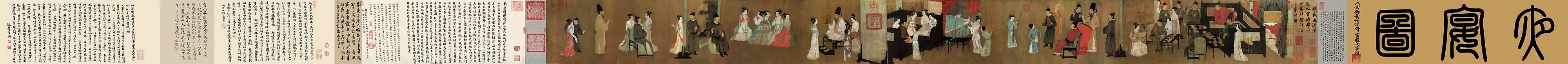 Night Revels of Han Xizai was painted by Gu Hongzhong during the Five Dynasties and Ten Kingdoms period when dynasties replaced one another at an alarming rate. Fives vignettes are told about a party that Han Xizai, a minister of Li Yu, hosts. In the first scene (viewed from right to left), Han listens to the pipa with his guests. Then, he watches dancers, takes a rest, plays string instruments, and finally sees guests off. It is believed that this painting was made in response to a request by emperor Li Yu to Gu,[15][16] following Han's declination of an offer to be Prime Minister. One interpretation is that the painting was a way of chastising Han for having a carefree nightlife rather than accepting greater political responsibility.