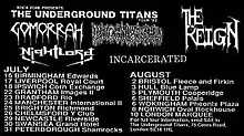 The Underground Titans Tour '92 was the brainchild of Nightlord guitarist Ferenc Collins and then Gomorrah guitarist Jose Griffin. Having seen the success of the Clash of the Titans tour featuring Megadeth, Slayer, Testament and Suicidal Tendencies which took these bands out of the club circuit and into major arenas, the idea was to take five unsigned but successful bands and take them from the usual pub circuit into the club circuit. Featuring a rotating bill of; Decomposed, Gommorah, Incarcerated, Nightlord and The Reign the tour reached over 2000 people, culminating in a show at London's Marquee Club,[6] and the tour is still universally recognised to this day as the first truly Underground Metal tour. The tour picked up considerable column inches in the only existing Heavy Metal publications of the day, Kerrang![7] and Metal Hammer,[8] as well as a special article in The Sunday Times newspaper, exposure that was otherwise unheard of for unsigned bands at the time.