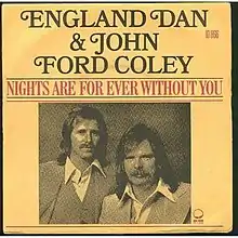 The song peaked at No. 10 on the U.S. Billboard Hot 100 chart for two weeks and number four on the Easy Listening chart.[9] It charted very similarly in Canada. England Dan's brother Jim Seals had a Top 10 song at the same time with "Get Closer."[10][11][12] Along with "I'd Really Love to See You Tonight," "Nights Are Forever Without You" brought England Dan and John Ford Coley into national prominence after more than a decade of singing together.[13] The duo claimed that the success of this song made them feel more secure after the overnight success of its predecessor.[14]