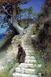 In 1902, against her father's wishes, he married Olga Khitrova, a young woman from an old noble family who was only seventeen.[2] Two years later, he made his first trip to Greece and stayed for a year. He taught painting at the "Imperial Society for the Encouragement of the Arts" from 1897 until 1919.[1] From 1900, he was the Inspector there, and became a full member in 1909, the year that he helped create the "Kuindzhi Artists' Society". In 1916, he was named an Academician.[3]