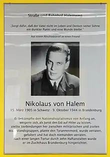 In the vicinity of Plötzensee Prison in Berlin, a street was named Halemweg in 1957. Nearby is the U-Bahn station likewise named Halemweg. In the station is a plaque, erected in honour of Halem's in September 2010. In Brandenburg an der Havel is a street named after him: Nikolaus-von-Halem-Straße.[6]