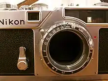 ![]() The Nikon S-mount seen as part of the 1957 Nikon SP. The distance scale is for use with lenses using the internal bayonet. | |