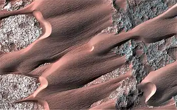 Nili Patera is a dune field on Mars. It is located on top of a lava bed, at the site of an ancient volcano, the Nili Patera caldera of Syrtis Major, near the Martian equator,[1] and it is one of the most active dune fields of Mars. Its location coordinates on Mars are 8.7° N latitude, 67.3° E longitude.[2] It is being actively studied by the HiRISE camera, on board the Mars Reconnaissance Orbiter, at the rate of one image every six weeks. The study of the movement of the dunes provides information regarding wind variation as a function of time and furthers the study of surface erosion characteristics of the Martian landscape. This information can then be used for the development and design of future Mars expeditions.[1][3] The dunes of the Patera field are of the barchan type and their study by HiRISE was the first one to establish dune and ripple movement of a minimum of 1 metre (3 ft 3 in) on Mars.[4] The Patera dune field, was also the first to be investigated using the COSI-Corr software, which was originally developed to analyse the movement of earthbound dunes.[4] The research results from the evidence provided by the monitoring of the Nili Patera field, indicate sand fluxes of the order of several cubic metres per metre per year, similar to the flux observed at the sand dunes of Victoria Valley in Antarctica.[5]