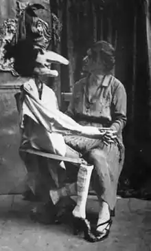 Pushing design to the limits, Simonovich-Efimova created puppets to be worn on the head, allowing the puppeteer to manipulate several characters simultaneously. She patented a new type of rod puppet with rods attached to the elbows to free up the hands. The rods were hidden behind hanging costumes.[31][32][29] To make puppets look more lifelike, the Efimovs devised a system where the arms were elongated. Rods rather than the puppeteer's fingers were inserted into the glove to manipulate the arms, which were allowed to move by manipulating strings inside the body of the doll.[33] Simonovich-Efimova utilized other apparatus, like springs in the body of a cat puppet to give it the flexibility of a live animal.[34] These innovations allowed their finely formed, elegantly clad puppets to move about naturally, rather than with the stiff, jerky movements of their predecessors.[35] In an era when almost all puppet performances were designed to entertain children or present government ideology, Simonovich-Efimova went out of her way to perform shows for adults, including The Enchanted Pear Tree, Macbeth, and works by Molière and Mikhail Saltykov-Shchedrin.[31][12] Though she also made adaptations in her work with fables to replace what were seen as outmoded ideas, like replacing serfs with young communist characters,[32] Simonovich-Efimova's focus was on artistry, entertainment and professionalism.[36] She also developed a new system of life-sized manikins,[3] blurring the lines between puppetry and acting, when she danced on stage with her Petrushka.[31] Between 1920 and 1940, the Efimovs performed between 1,500 and 2,000 puppet shows.[3][12]