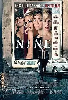 Nine is a 2009 romantic musical drama film directed and co-produced by Rob Marshall from a screenplay by Michael Tolkin and Anthony Minghella, based on the stage musical of the same name, which in turn is based on the 1963 film 8½. In addition to songs from the stage musical, all written by Maury Yeston, the film has three original songs, also written by Yeston. The ensemble cast consists of Daniel Day-Lewis, Marion Cotillard, Penélope Cruz, Judi Dench, Fergie, Kate Hudson, Nicole Kidman, and Sophia Loren.